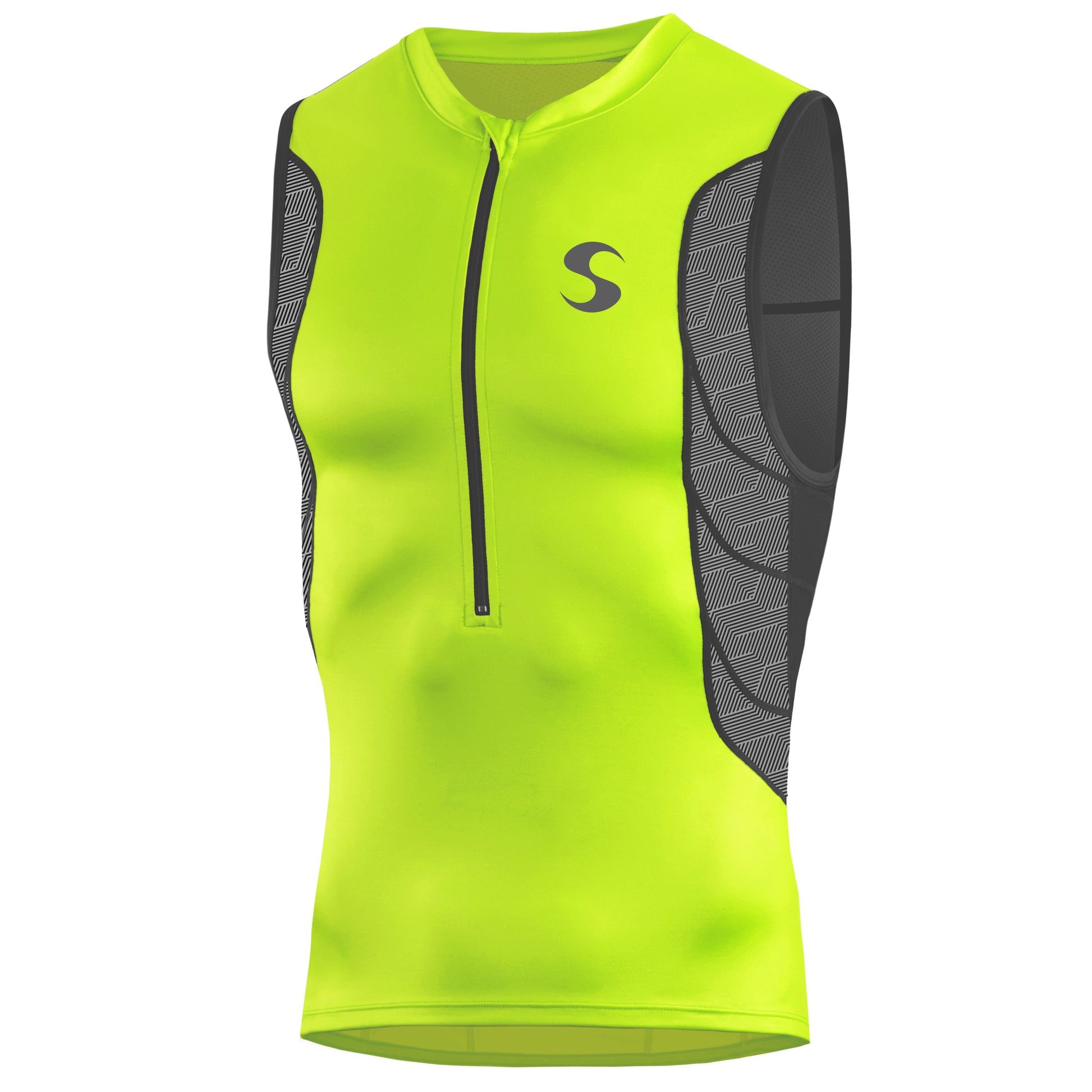 Tri singlet utilizes the highest quality nylon. With its 70D elastane for a quick drying, breathable result when out of the water makes Tri singlet versatile and form fitting. Our elite tri singlet has a flattering design with graphic lines and flatlock seams.
